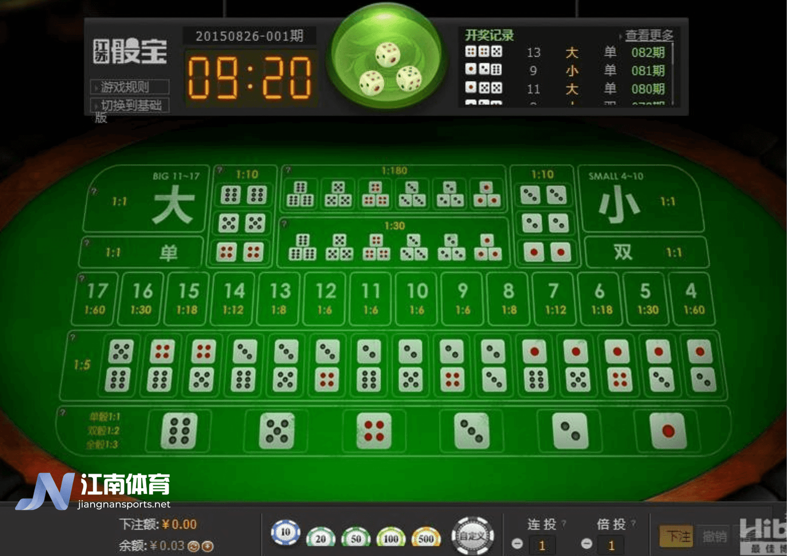 这是一种使用三个骰子的游戏,允许玩家对各种投注选项进行下注,以预测骰子的组合。